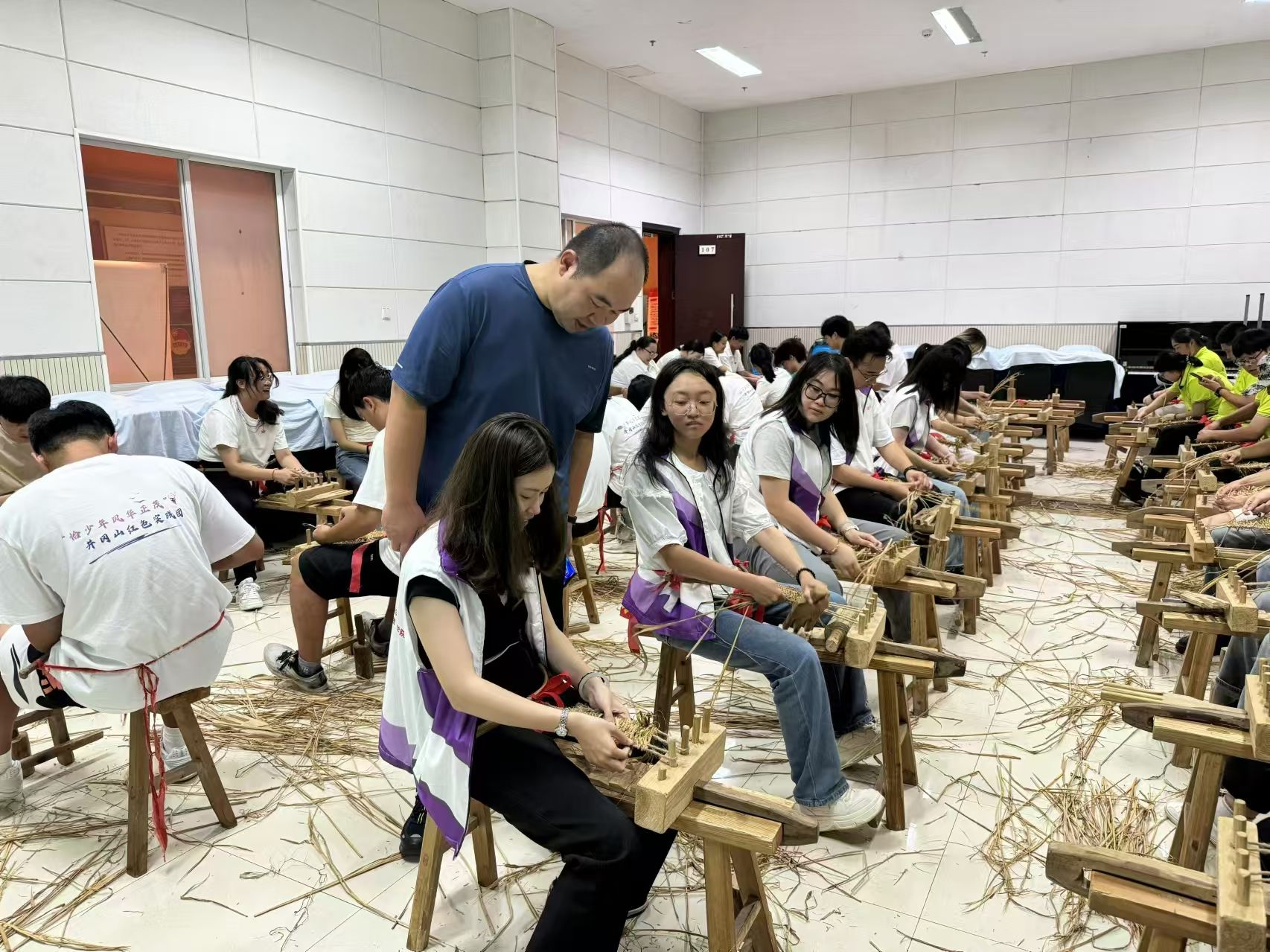 当日下午,怀着崇高的敬意,实践团走进了“革命后代话初心·讲家风”的互动课堂。此次互动教学,基地邀请了两位革命烈士的子女,老十八军夏川之子芦继兵,开国少将谢良之女谢虹。他们的讲述,让同学们了解到一批鸿才睿智、甘于献身的革命先辈们,也更加坚定了成员们攻坚克难、砥砺奋进的信念。为学习红军革命先辈们艰苦奋斗、坚韧不拔的革命精神,团队成员于当日晚上,跟着讲解员老师学习红军编草鞋的历史,跟着基地的草鞋工艺制作老师学习编织红军草鞋。一根根稻草手搓为股,绕绳编绕,再经过锤击、连接与修剪,就编出了一双双的红军鞋。
